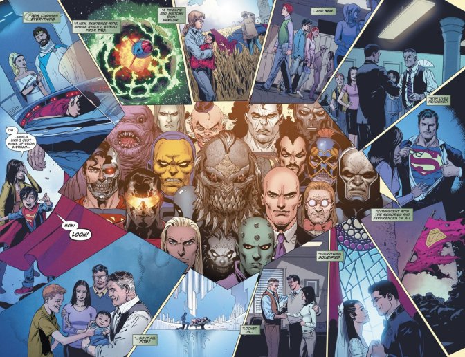 What you will probably take away from this book more than the story, though, are the many standout images. Doug Mankhe’s art is truly something special and makes this reality-bending issue a feast for the eyes. The last few pages are littered with instantly iconic panels – the Kents victorious and reunited, the splash panel glimpse at the rewritten timeline and finally Superman reborn (complete with slightly revised costume). Conversely, his Mxy isn’t the traditional goofy imp but a figure from your nightmares, with his manic, bulbous eyes and wide, toothy grin.