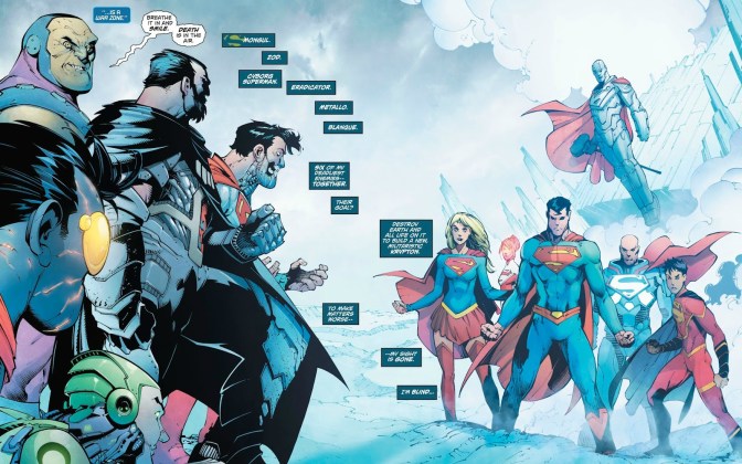 The issue begins by picking up the cliffhanger from last issue – the assembled Super-Family arrive to aid the Man of Steel in his battle against the Superman Revenge Squad outside the Fortress of Solitude. After a few brief pages of recap, the issue wastes no time in getting ahead with the battle that has been brewing for several issues now. And boy, does it pack a punch.