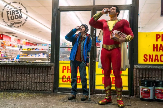 EW unveiled the image which promises the most light-hearted, fun DC movie to date. It features Levi in costume as Shazam, who is really teenager Billy Batson until he says the titular magic word, alongside Billy’s best pal, Freddie Freeman (Jack Dylan Grazer).